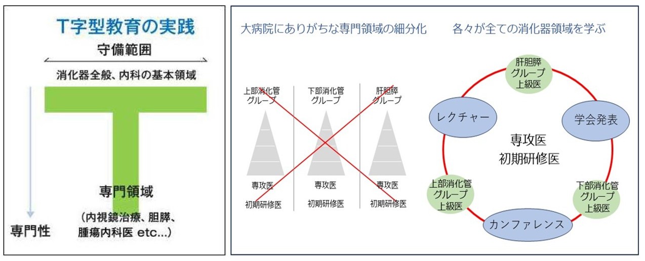 - 2.滋賀医大消化器内科における研修の大きな特徴として「専門分野を細分化せず、内科医として幅広いskillを身につける」ことが挙げられる。大病院にありがちな領域ごとに細分化されたgroup分けはなく、医師同士の垣根もない。皆それぞれの専門分野を持ちながら出来るだけgeneralな内科医としてのskillを取得できるような環境づくりを目指している(T字型教育の実践)。