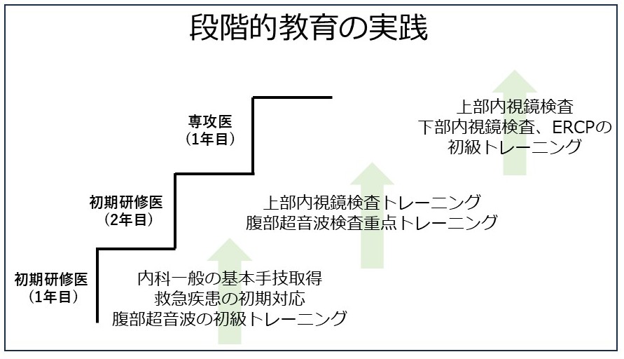 このように初期研修医の比較的早い時期から消化器内科の専門的なskillを体験することは専攻予定の有無にかかわらず、研修に対するMotivationの向上・消化器病学のより深い理解に繋がり、非常に教育的と考えている。また、2年目の選択期間に内視鏡や超音波検査の初期トレーニングを経験することにより専攻医(3年目)開始時点から専門医取得に向けたのためのprogramの開始が可能である。具体的には専攻研修が終了する頃には腹部超音波検査の習得はもちろん、多くの上下部内視鏡のroutine手技(EMR含む)、肝生検、ERCPでの胆管挿管(難治例は除く)などが指導医の助言の元、自ら完遂することが可能となる(研修早期からの段階的教育の実践)。